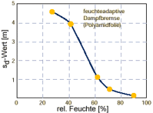 Raumseitige Dampfbremsen sind zur Herstellung einer luftdichte Ebene oder bei Innendämmungen zur Vermeidung von Bauschäden und Tauwasseranfall notwendig. Konventionelle Dampfbremsen haben aber den Nachteil, dass sie im Sommer die Austrocknung der Konstruktion zur Innenseite verringern, da die Diffusion in beide Richtungen gebremst wird. Die seit einiger Zeit am Markt befindlichen Dampfbremsen mit Löschblatt-Effekt führen die Feuchtigkeit aber erst aus der Konstruktion, wenn sie in Form von Wasser vorliegt. Das kann für manche Dämmstoffe aber zu spät sein, da die meisten Dämmstoffe recht feuchtigkeitsempfindlich sind. Eine neuere Entwicklung sind die feuchteadaptiven Dampfbremsen. Bei diesen wird dir Größe des Diffusionswiderstandes in Abhängigkeit von der Luftfeuchtigkeit jahreszeitlich angepasst. Eine vom Fraunhofer Institut entwickelte Dampfbremse weist z.B. folgende Kennlinie auf: | |||||||||||||||||||||||||||||||||||||||||||||||||||||||||||||||||||||||||||