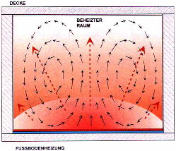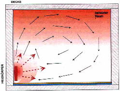 So kann die aufsteigende Warmluft (Konvektion) die kalte Luft an den Fensterflächen mit nach oben reißen und verhindert so, dass der Raum fußkalt wird (warme Luft steigt nach oben, kalte Luft fällt nach unten). Besonders in hohen Räumen sollte darauf geachtet werden, dass Heizkörper mit hohem Strahlungsanteil (z.B. Fußboden- oder Fußleistenheizung) eingebaut werden. Bei Wärmeabgabe überwiegend durch Konvektion steigt die warme Luft schnell nach oben und der Aufenthaltsbereich bleibt kalt. Neben den folgenden Heizkörperarten gibt es noch viele ungenormte Formen. Letztendlich entscheiden technische, gestalterische und wirtschaftliche Gründe Gliederheizkörper Bei Gliederheizkörpern / Radiatoren sind die einzelnen Glieder unten und oben durch Gewindenippel oder Verschweißungen verbunden. Radiatoren geben ihre Wärme bis zu 40 % in Strahlungswärme ab. Gussradiator: Sie bestehen aus Gusseisen mit Lamellengraphit. Die einzelnen Glieder sind durch Stahlnippel verbunden. Sie zeichnen sich durch hohe Korrosionsbeständigkeit und lange Haltbarkeit aus. Stahlrohrradiator: Sie bestehen aus Stahlrohren (Außendurchmesser 25 mm, Wanddicke 1,25 mm). Diese Radiatoren sind in sehr vielen Ausführungen (Bauhöhe: 190 mm bis 2 800 mm, 1- 6 säulige Bautiefen, gerade oder gebogene Formen, Farben etc.) erhältlich. Sie lassen Architekten großen gestalterischen Spielraum. Stahlradiator: Die Einzelglieder (zwei gepresste, zusammengeschweißte Halbschalen; Stahlblechdicke: 1,25 mm) werden durch Blockschweißung verbunden. Plattenheizkörper: Plattenheizkörper bestehen aus Stahlblech, das mindestens 1,25 mm dick ist. Sie werden ein- oder mehrreihig, glattwandig oder senkrecht profiliert hergestellt. Um die Wärmeleistung zu verbessern, werden häufig entweder zwischen den mehrreihigen Plattenheizkörpern oder an der Rückseite Konvektorschächte aus Blech angeschweißt. Zusätzlich werden sie häufig mit seitlichen und oberen Verkleidungsblechen angeboten (Fertigheizkörper). Plattenheizkörper geben ihre Wärme bis zu 40 % in Strahlungswärme ab. Aluminium- Gliederheizkörper: Sie werden durch ein Druckgussverfahren hergestellt. Bei ungünstigem Wasserverhältnis (hoher Sauerstoffanteil) besteht Korrosionsgefahr. Sie sind im Verhältnis zu anderen Gliederheizkörpern verhältnismäßig teuer. Konvektoren Konvektoren geben ihre Wärme hauptsächlich durch Konvektion (Luftumwälzung) ab. Um ihre Wärmeleistung zu erreichen, müssen sie entweder in Schächten oder aber auch in Fensternischen mit geschlossener Verkleidung eingebaut werden. Sie werden aus Kupfer, Aluminium oder verzinktem Stahl hergestellt. Diese Heizkörper bestehen aus waagerechten Rohren, die mit rechteckigen Lamellen aus Blech umgeben sind (erhöhen die Heizleistung). Die Wärmeleistung wird durch verunreinigte Konvektoren, zu große Spalte zwischen Wand und Konvektor bzw. Konvektor und Verkleidung oder auch zu große bzw. zu kleine Luftein- und Luftaustrittsschlitze. Da sie aus technischen Gründen verkleidet werden müssen, bietet sich die Möglichkeit an, sie unsichtbar (z.B. hinter Sitzbänken, Schränken etc.) einzubauen. Unterflurkonvektor: Ein Unterflurkonvektor ist ein Konvektor, der in einem Bodenkanal montiert wird, und mit einem begehbaren Gitter abgedeckt ist. Dies bietet sich vor allem bei Fenstern an, die bis zum Boden reichen. In Fällen wo die Bauhöhe zu gering ist und somit die Wärmeleistung nicht ausreicht, wird der Konvektor häufig mit einer Fußbodenheizung kombiniert. Ventilator- Konvektor: Ein Ventilator- Konvektor erzwingt durch den Ventilator eine Konvektion und erhöht so die Wärmeleistung. Er wird für Büros, Schwimmbäder, große Wohnräume etc. verwandt. Flächenheizkörper: Flächenheizungen geben die Wärmeleistung überwiegend durch Strahlung ab (Strahlungsheizungen). Fußbodenheizung: Wärmeverteilung: | ||||||||||||||||||||||||||||||||||||||||||||||||||||||||||||||||||||||||||